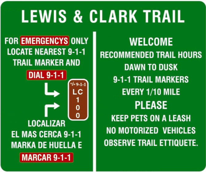 Many bike trails in Woodbury County have been mapped and mile marker signs have been installed to assist during emergencies. Each sign shows 911 and gives the mile marker number every tenth of a mile. When calling an emergency on the trail, giving the operator the mile marker number enables emergency responders to more easily locate you.